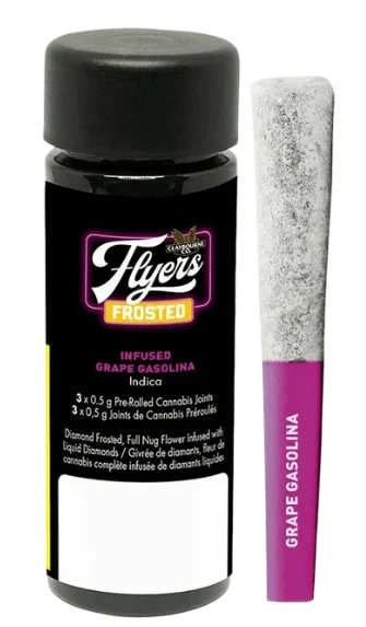Claybourne Frosted Flyers Infused Grape Gasolina pre-rolls are THCa diamond frosted, terpene enhanced and infused with liquid diamonds. These 3x0.5g pre-rolls are indica-dominant and boast 40-50% THC. Looking for bold flavour and a potent experience? Look no further than Claybourne Frosted Flyers.