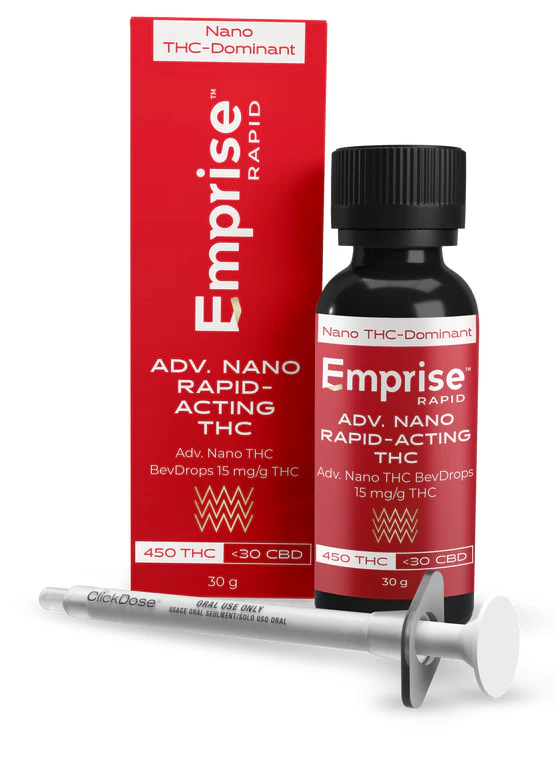 Emprise's Adv. Nano THC BevDrops deliver a 15 mg/g THC-dominant product in water-soluble format. The product is formulated with Full Spectrum THC Cannabis Extract that is Water-soluble for rapid onset in as little as 10-15 minutes.